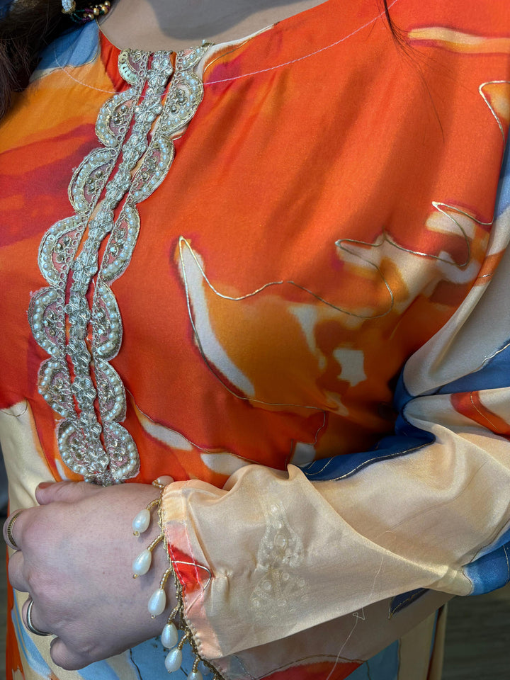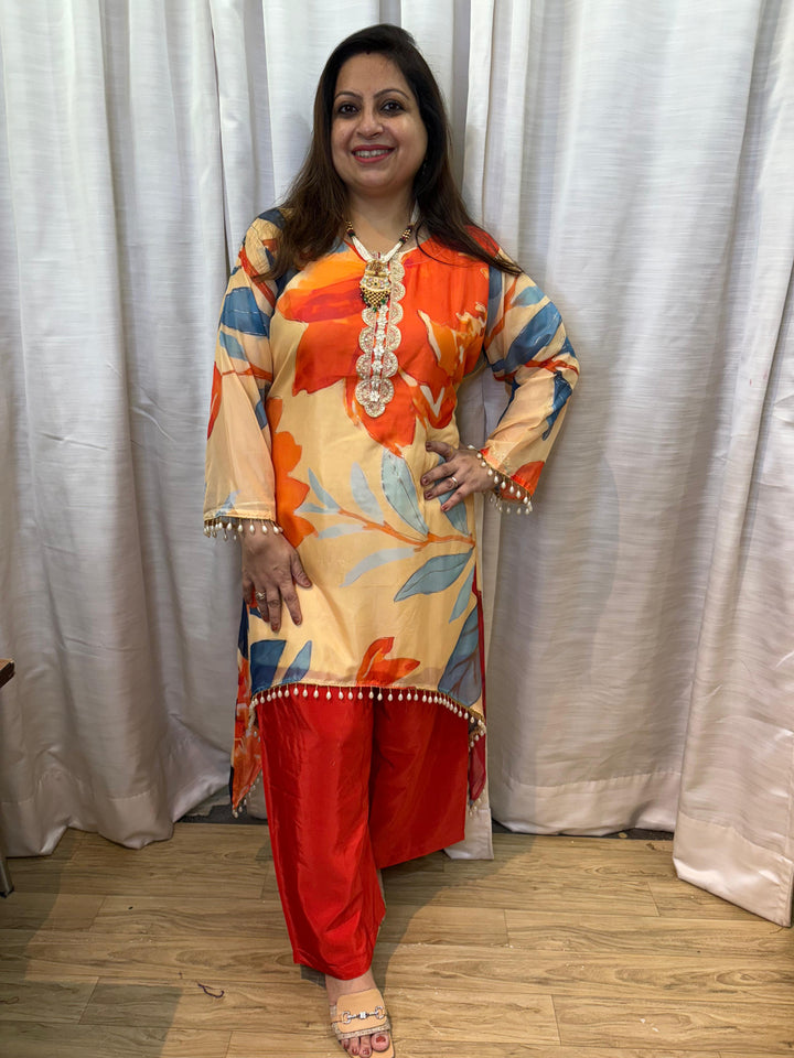 Kurta: Length -34 inches, Beige base kurta featuring bold floral prints in shades of orange, red, and blue. It is styled with a statement embroidered neckline and finished with pom-pom lace detailing along the hemline and sleeve edges, giving it a playful and chic touch.