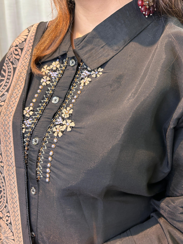 BLACK EMBROIDED MUSLIN SUIT SET WITH MULTICOLORED DUPATTA