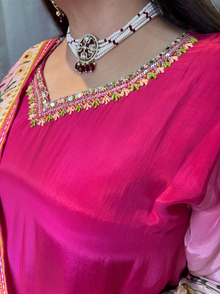 Step into summer style with this stunning Pink Ombre Suit Set. The kurta is crafted from soft, flowing fabric of crepe and features a beautiful gradient that transitions from a rich Rani Pink at the top to a delicate Blush Pink at the hem.