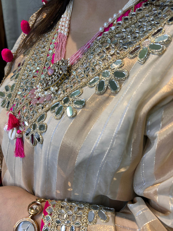 Mirror and Zari Work: The V-neckline is beautifully detailed with fine gold zari work, beads, and light mirror embellishments, giving the traditional touch a modern feel.