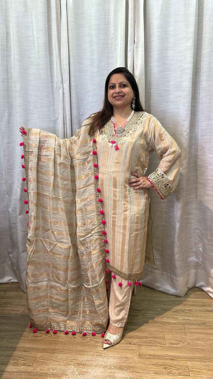 Lustrous Fabric: The three-piece set is crafted from a beautiful Chanderi or Chanderi-Silk blend fabric in a sophisticated Champagne or light gold hue. The kurta features an alluring vertical stripe pattern, achieved through fine weaving or subtle gold zari work, adding shimmer and length to the silhouette.