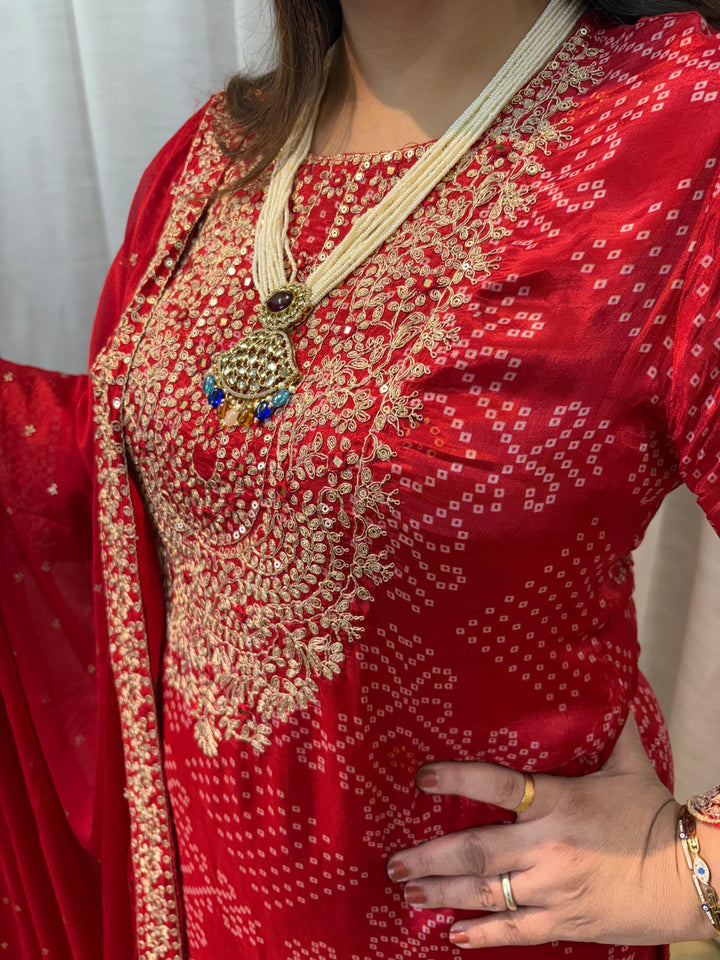 CHINNON CREPE RED BANDHANI STRAIGHT KURTA SET ( 10% off)