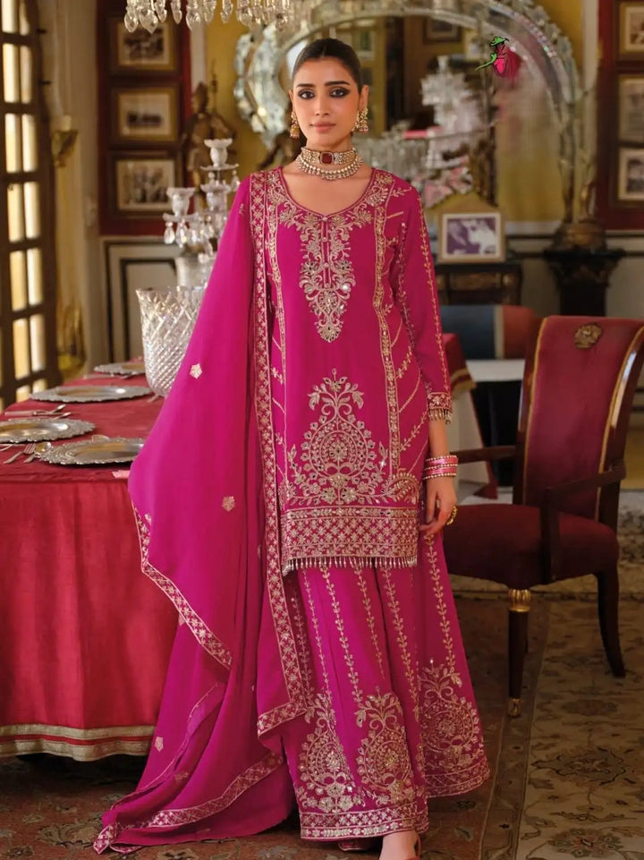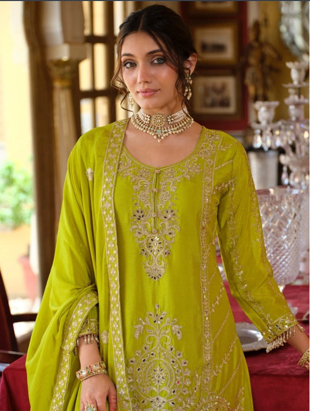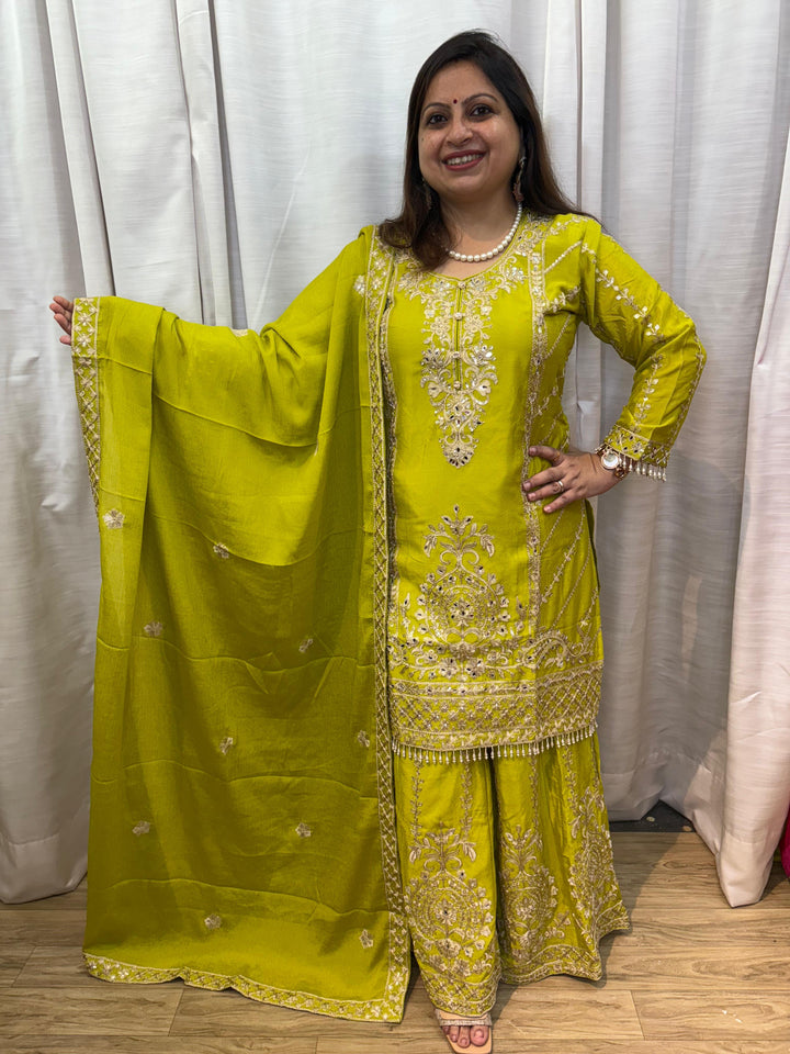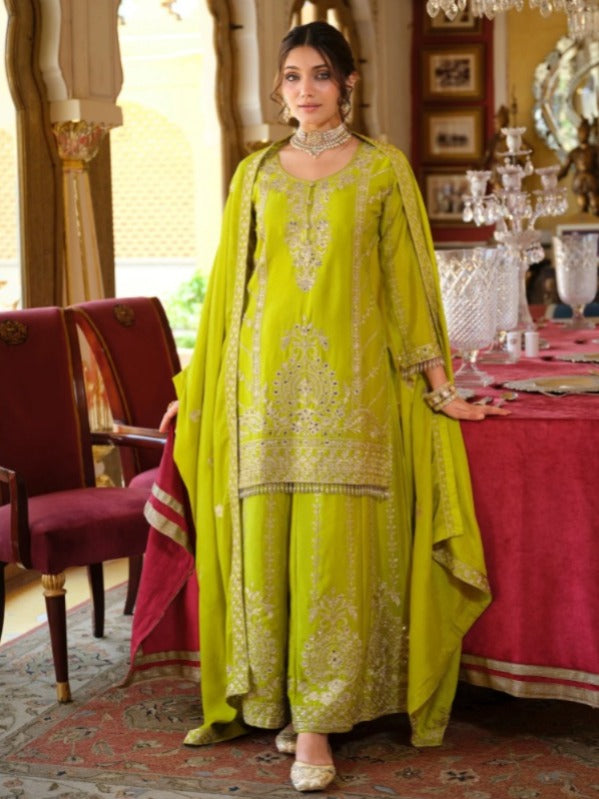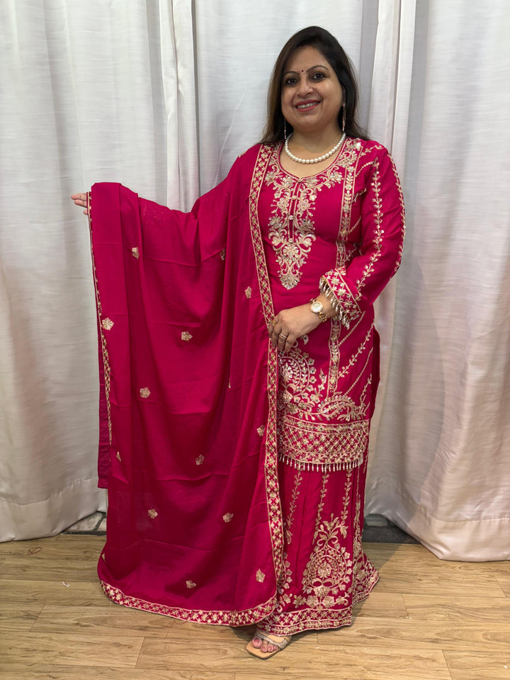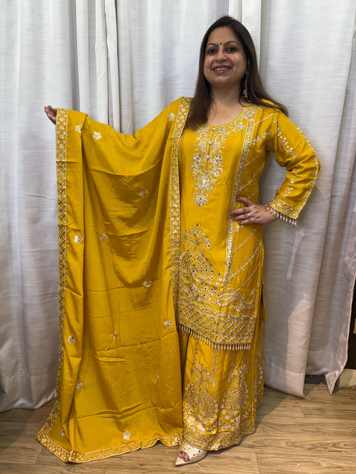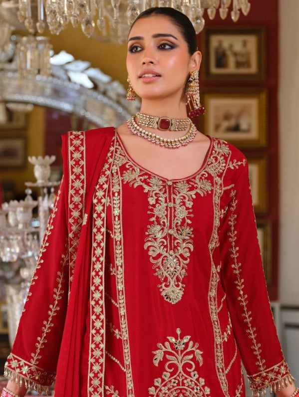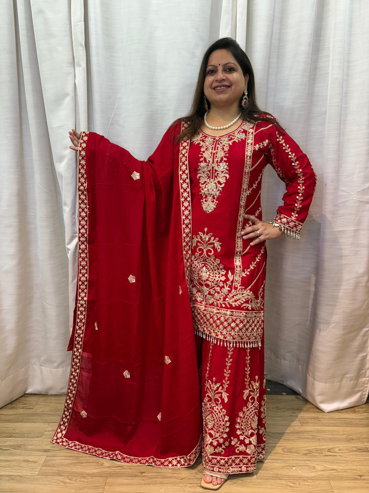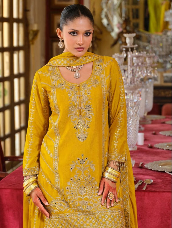 This stunning embroidered set is a true statement piece, exuding royalty and elegance. The intricate golden threadwork enhances its luxurious appeal, making it perfect for festive and wedding occasions. Paired with a flowy palazzo and matching dupatta, it offers both grace and comfort. A timeless ensemble that beautifully blends tradition with grandeur.