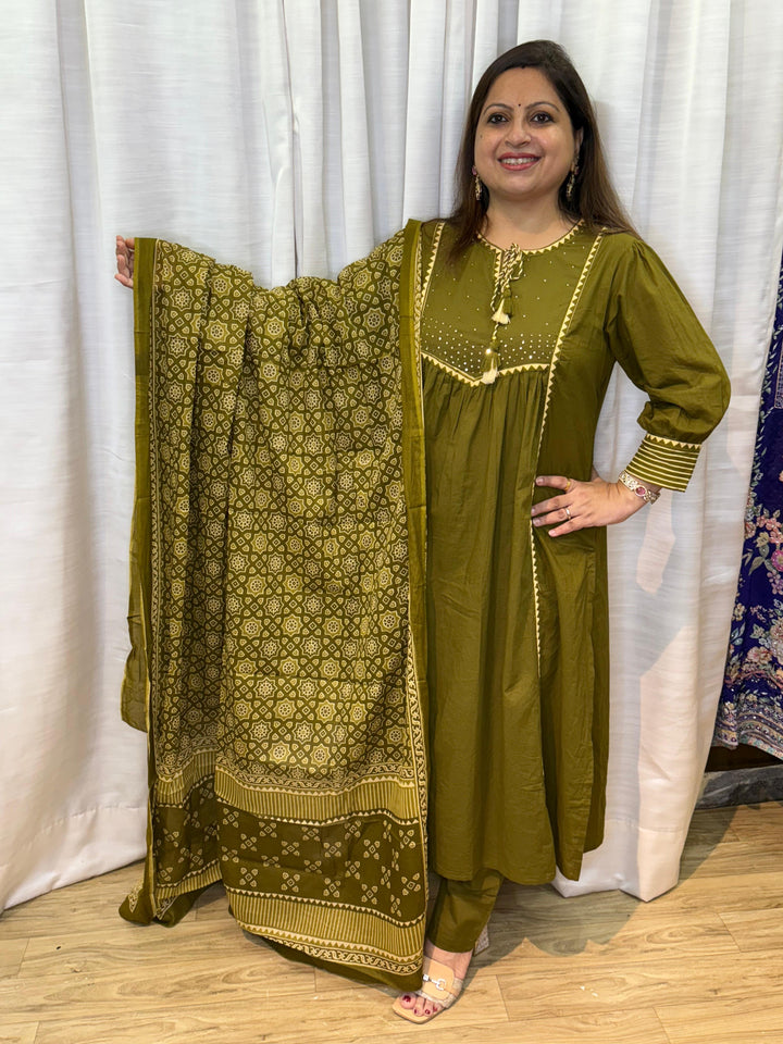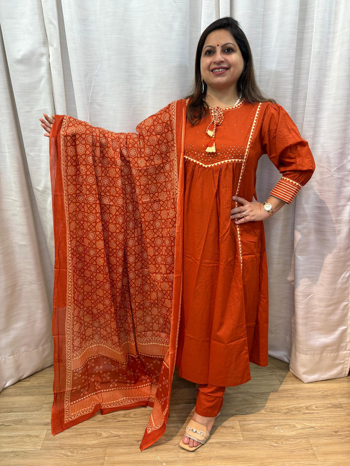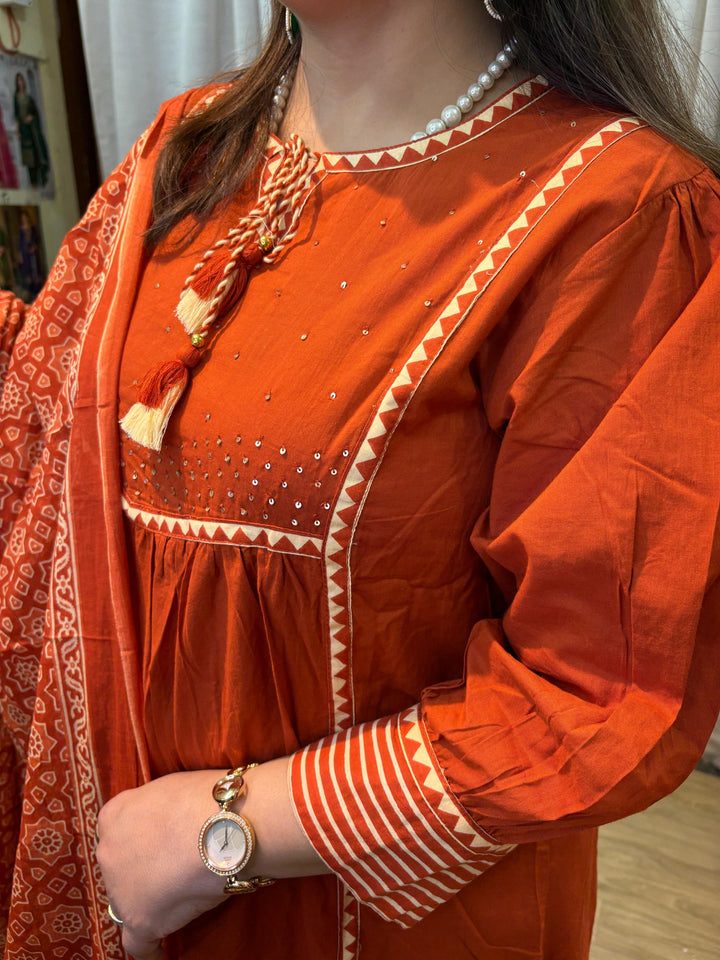 This is an suit set designed with a blend of comfort and style. The kurta features a round neckline with tie-up tassels, delicate lace detailing, and subtle gathers at the front for a graceful fall. The sleeves are finished with matching lacework, adding a refined touch. It is paired with pants and a beautifully printed dupatta that enhances the overall traditional appeal. Perfect for festive gatherings, casual outings, or family functions, this set offers a classy and sophisticated look.