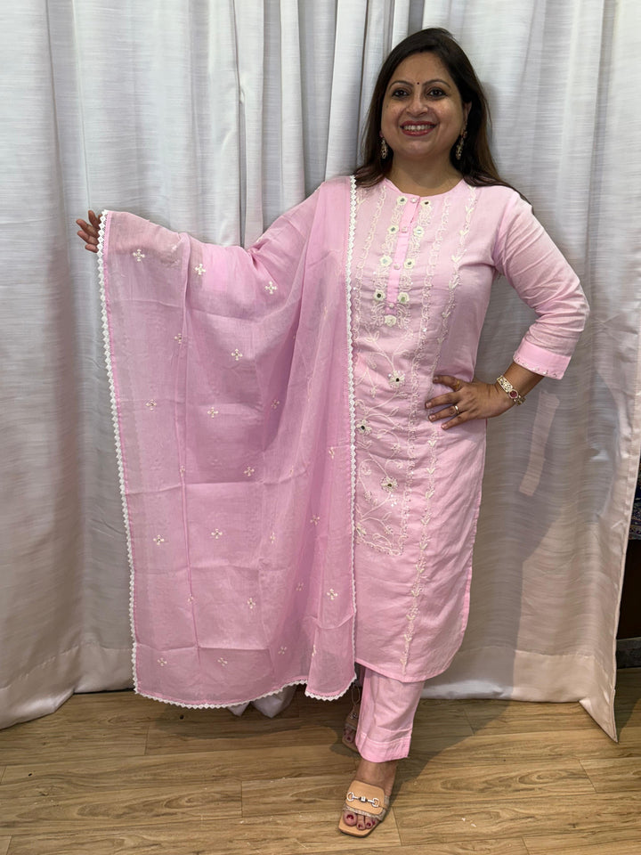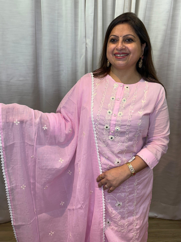 This ethnic set exudes elegance and charm. The straight-cut kurta is beautifully adorned with delicate white thread embroidery and button detailing on the front, giving it a refined look. It is paired with a matching dupatta featuring scattered floral embroidery and a dainty lace border, adding a touch of grace. Completing the outfit are simple straight pants , making it a soft, feminine, and versatile choice for festive occasions or daytime gatherings.