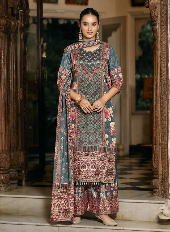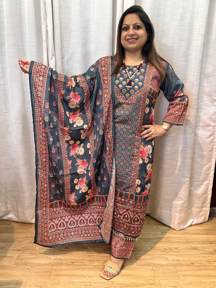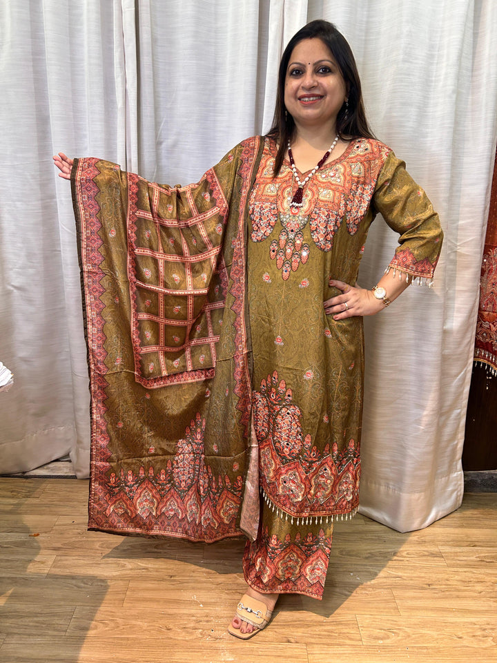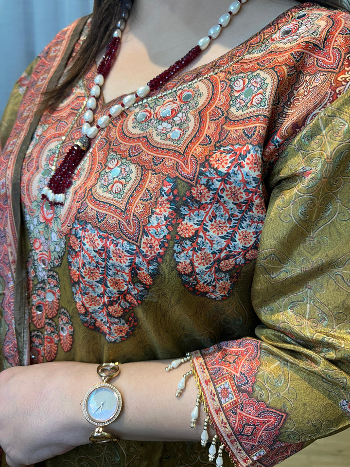 DIGITAL PRINT CHINNON EMBELLISHED KURTA SETS (Rust & Green)
