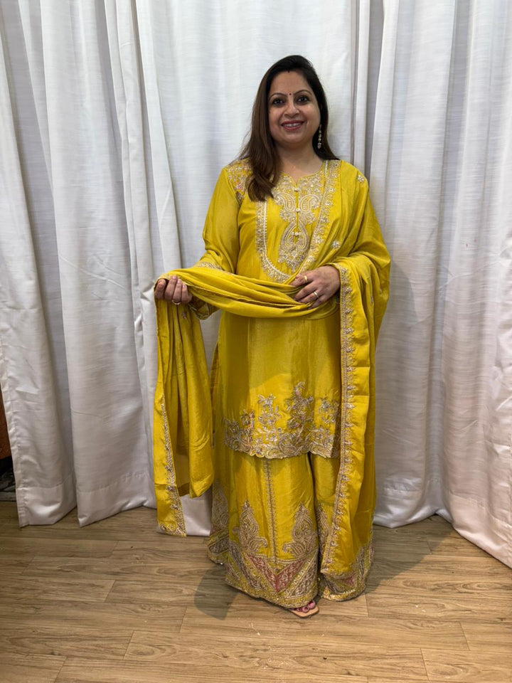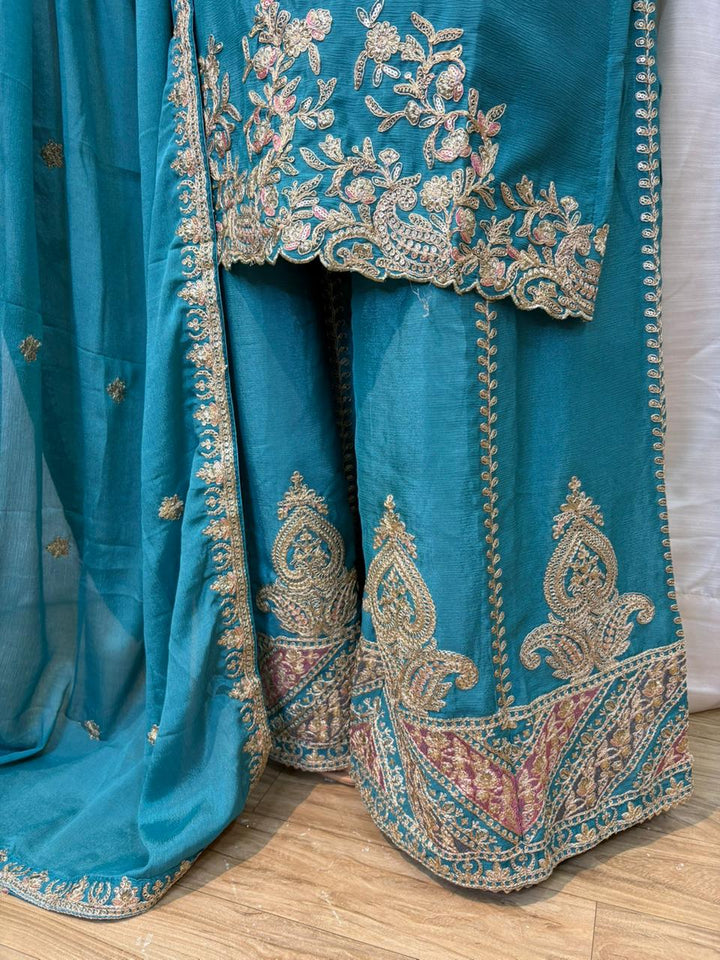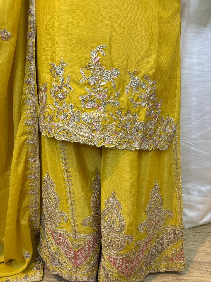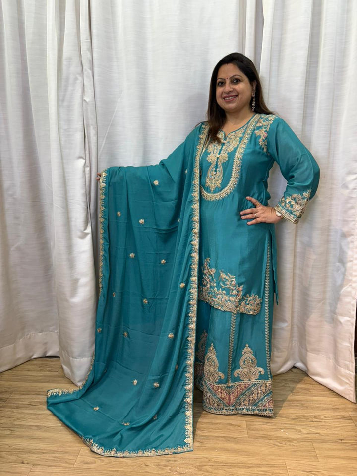 This stunning kurta set is adorned with intricate golden and thread embroidery, adding a regal touch to its rich fabric. The kurta features detailed work on the neckline, sleeves, and hem, creating a graceful silhouette. Paired with matching bottoms, the look is completed by an embroidered dupatta with delicate motifs and a fine border. Perfect for festive occasions and weddings, this ensemble blends elegance with traditional charm.