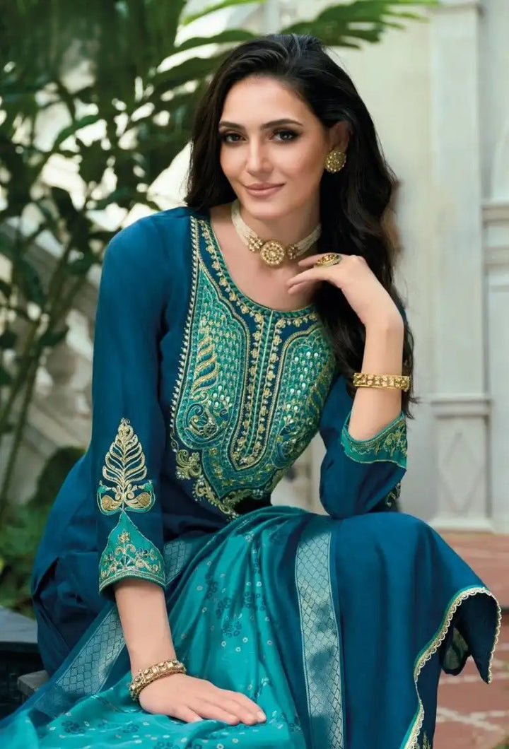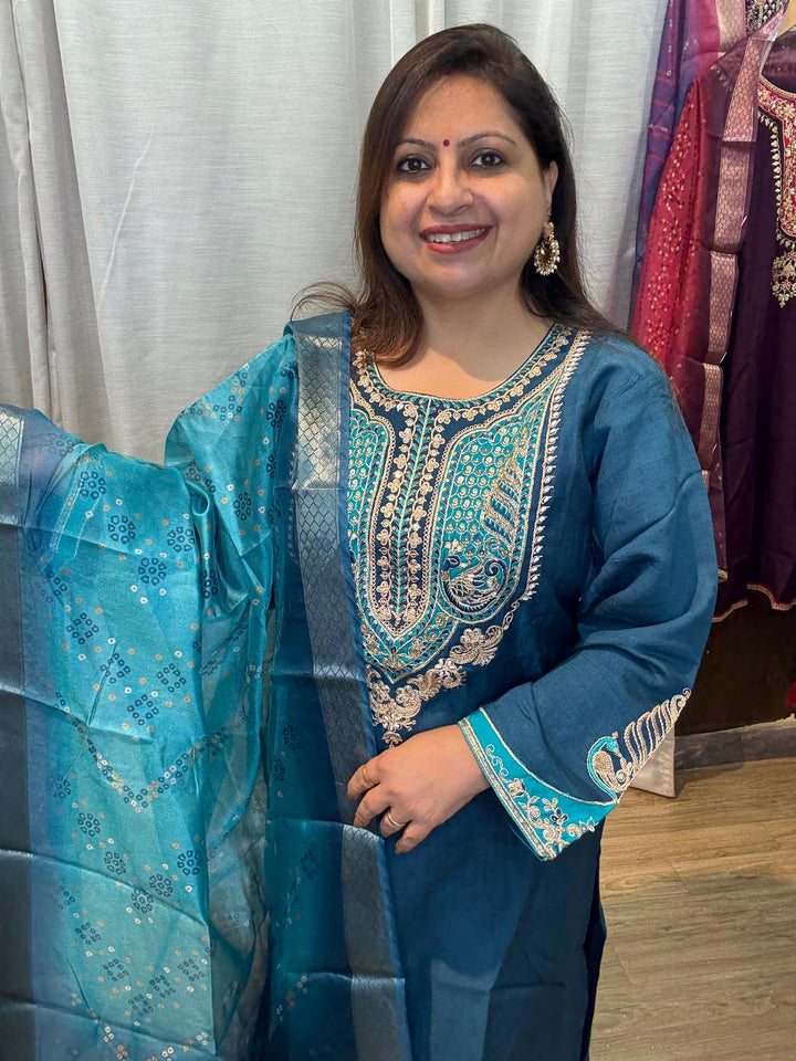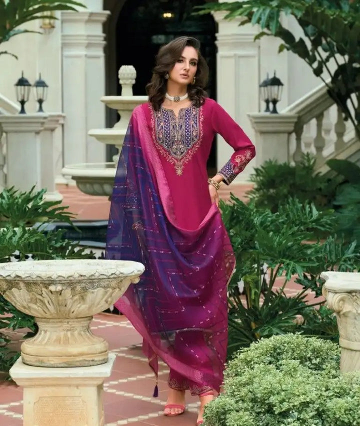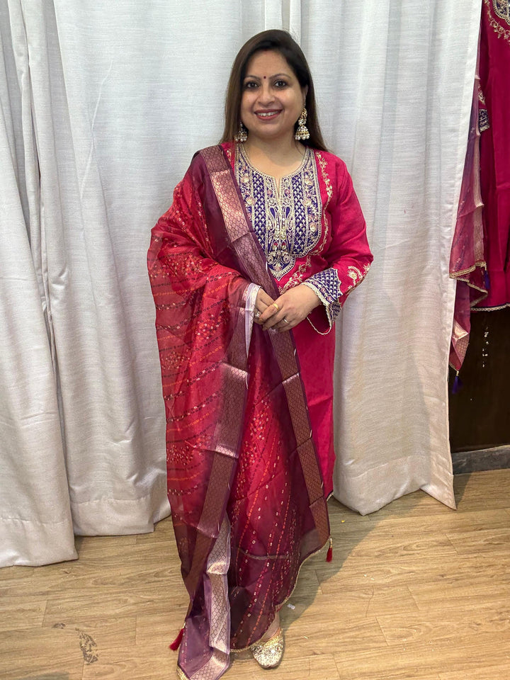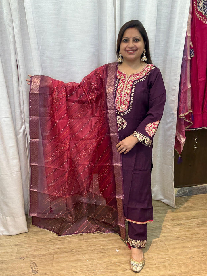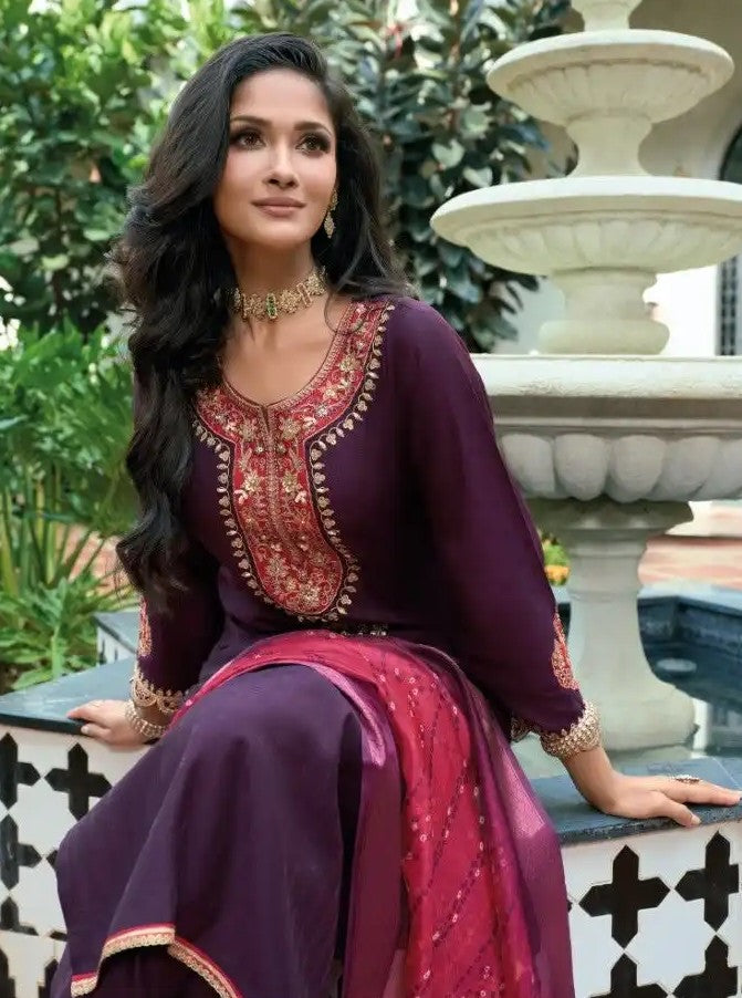 This elegant kurta set is designed to make a statement at any celebration. Crafted in rich fabric, it exudes festive charm and sophistication. The kurta is tailored for a flattering fit, paired with bottoms and a beautifully detailed dupatta that adds a graceful finish. Perfect for parties, weddings, or evening gatherings, this ensemble combines traditional elegance with a touch of modern glamour.