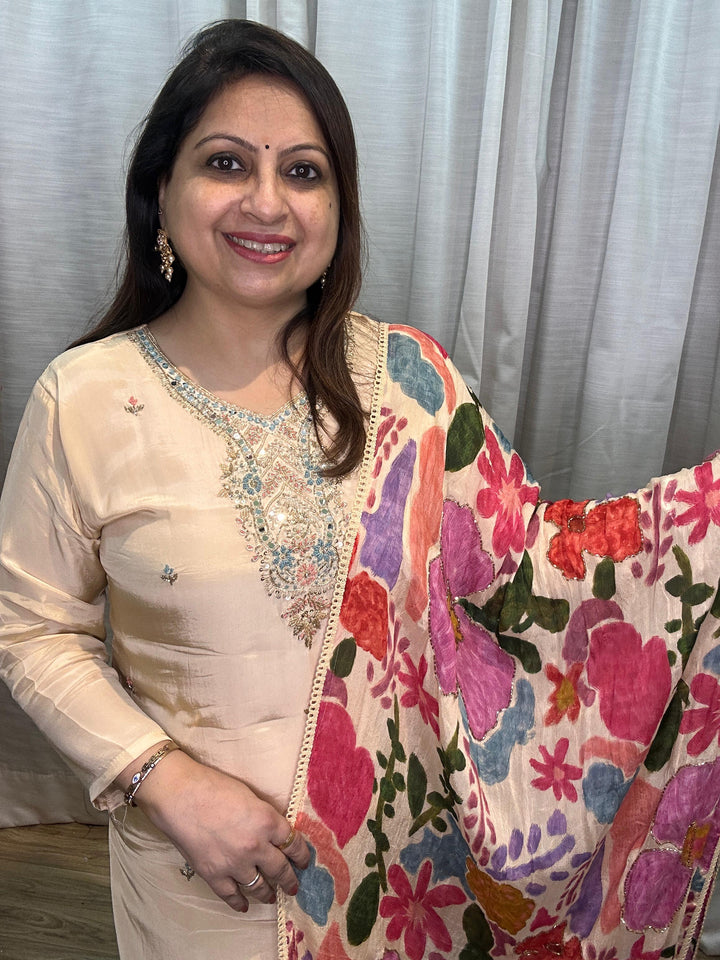 IVORY COLOURED HANDWORK SUIT SET WITH MULTI COLOURED FLORAL DUPATTA