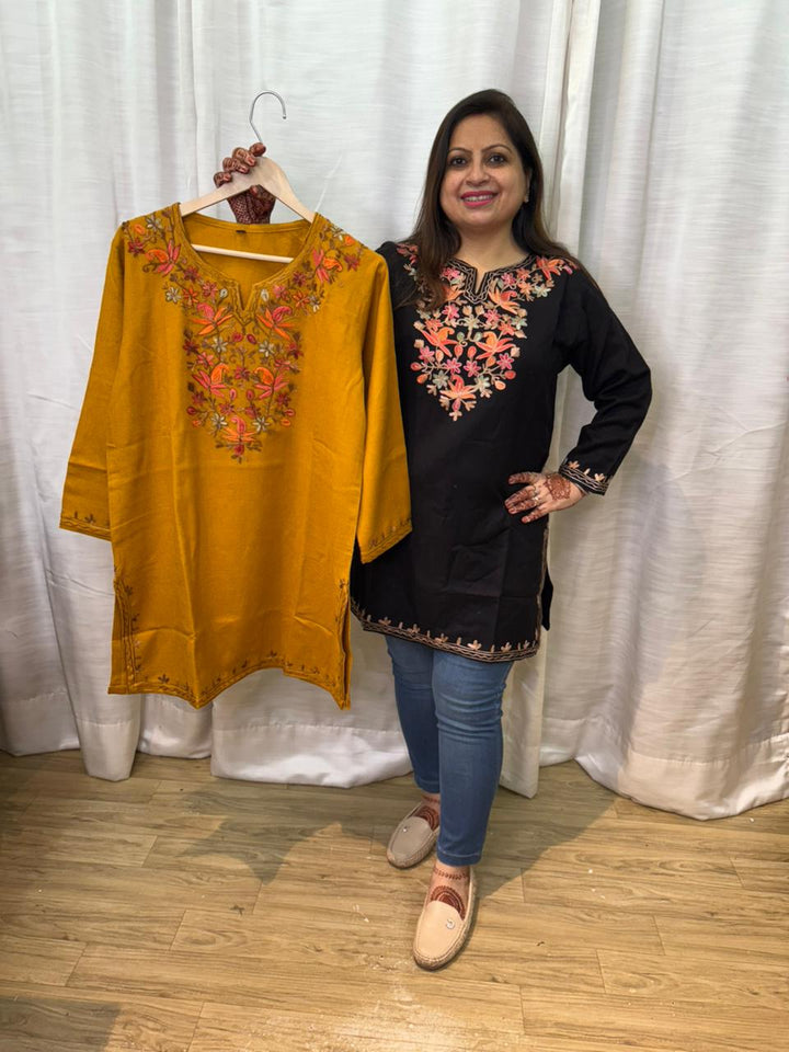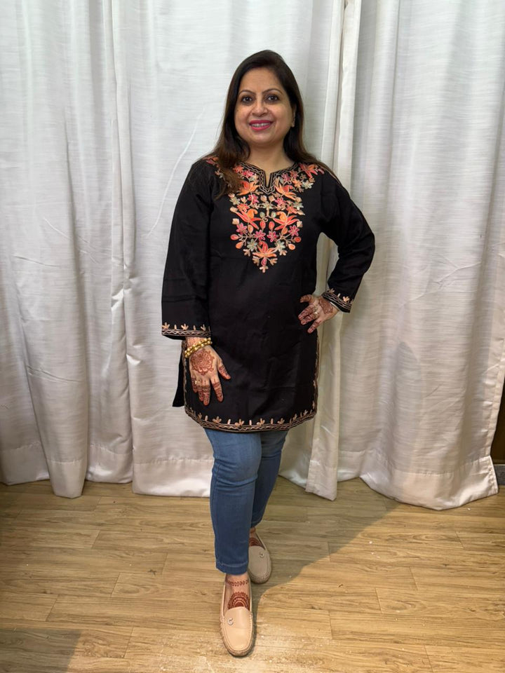 The kurti is a rich colored piece featuring beautiful floral embroidery concentrated around the neckline and extending down the chest area. The embroidery is done in vibrant hues of orange, mustard, and green, creating a striking contrast against the maroon base. It has a round neckline with a subtle slit in the center, giving it a touch of elegance. The sleeves are full-length with delicate embroidered detailing near the cuffs, and the hemline is adorned with a minimal border pattern. The overall look of the kurti is traditional yet stylish, making it suitable for casual gatherings or festive occasions.
