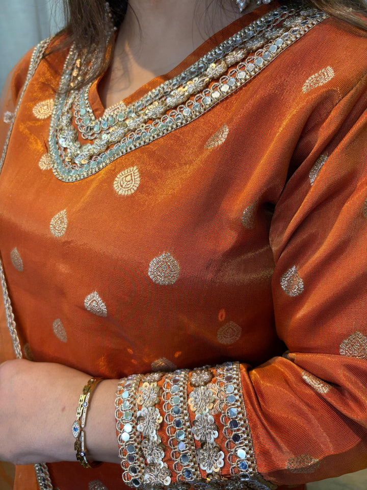 This is a vibrant orange embroidered suit set that beautifully blends tradition with elegance. The straight kurta features delicate golden embroidery and intricate lace detailing on the neckline, sleeves, and hemline, adding a festive touch. It is paired with matching straight pants showcasing coordinated embroidery at the borders. The set is completed with a sheer embellished dupatta adorned with dainty golden motifs and lace edges, making it perfect for festive occasions, weddings, and celebratory gatherings.
