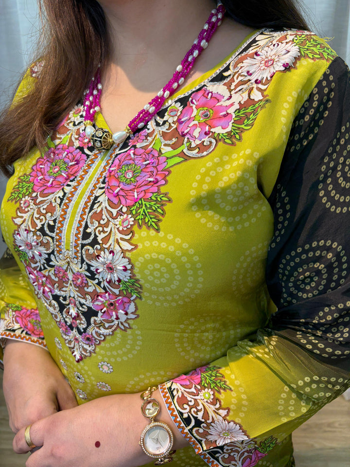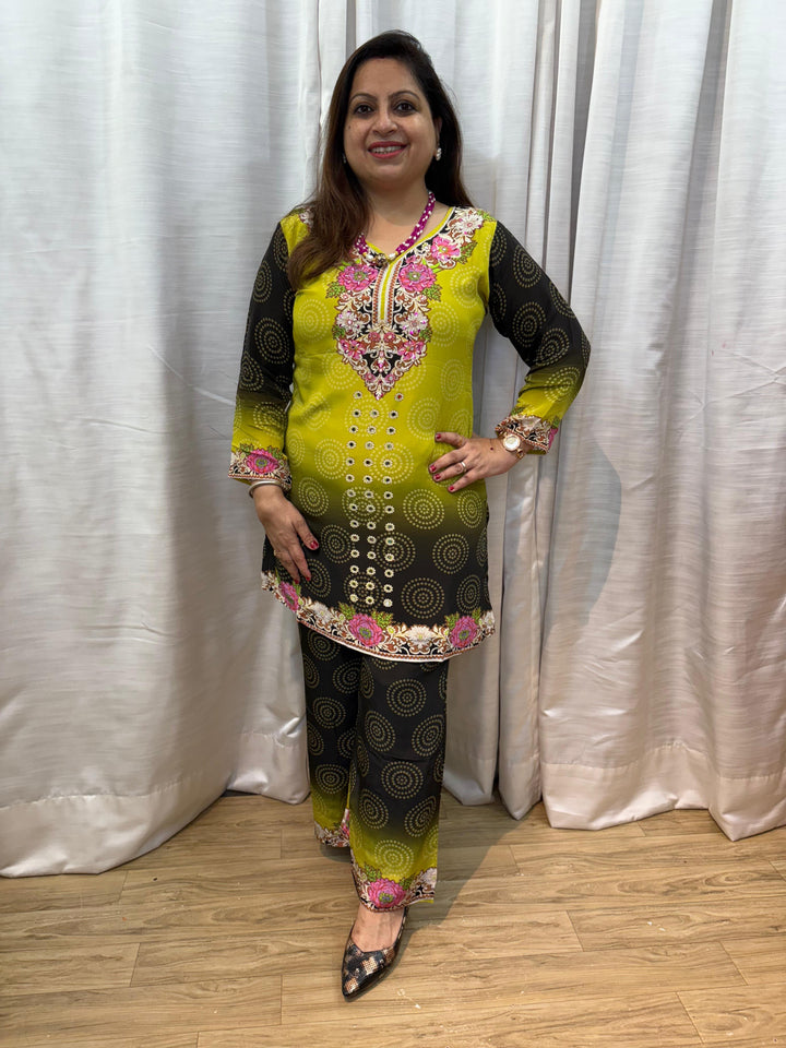Make a stylish statement with this lime green and black printed kurta set. The kurta features a unique circular geometric print across the fabric, enhanced with floral embroidery and printed detailing around the neckline and hemline. The sleeves and pants carry the same coordinated print, giving the set a chic and contemporary vibe. The contrast of bright lime with deep black makes this outfit eye-catching yet elegant, perfect for casual outings, festive gatherings, or semi-formal occasions.