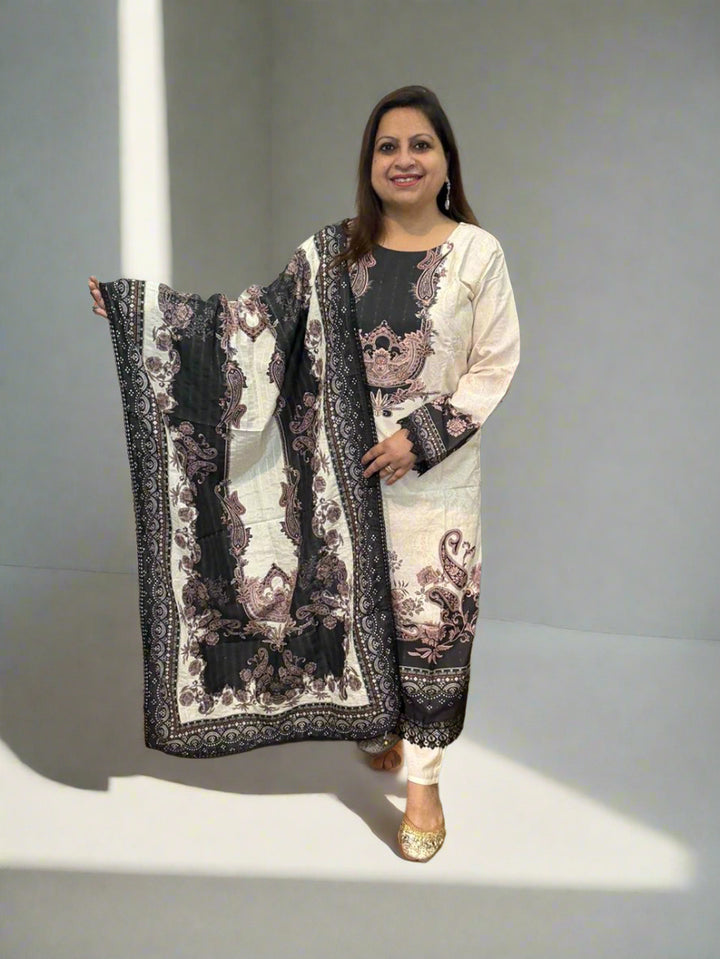 This black and white kurta set features elegant paisley and floral prints that create a striking contrast. The matching dupatta with a detailed border enhances its traditional charm. Perfect for both casual and festive wear, it blends sophistication with comfort.