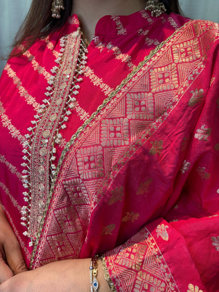 Add a touch of traditional elegance to your wardrobe with this pink banarsi inspired suit set, perfect for festive and cultural occasions.