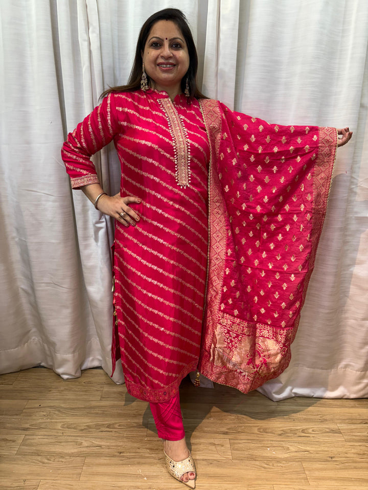 Kurta Design: Bright pink kurta with diagonal silver bandhani-style stripes, highlighted with subtle embroidery along the neckline and sleeve edges.