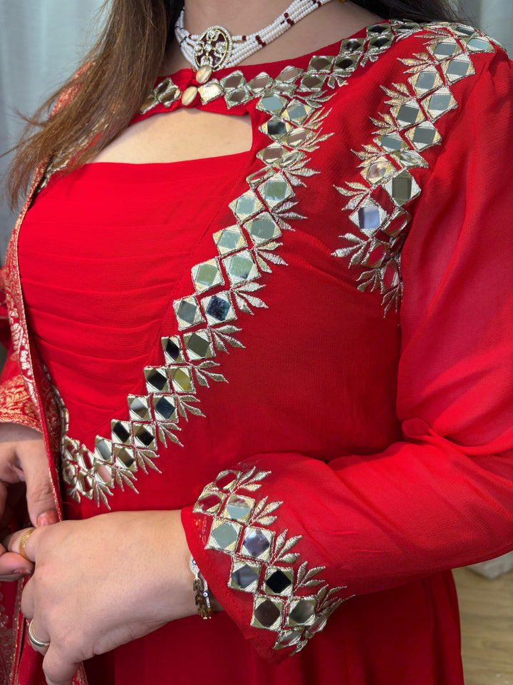 Embrace timeless glamour with this magnificent red Anarkali gown and dupatta set. Crafted from premium, free-flowing georgette, the gown features a flattering, full-sleeved design with a beautiful drape that flares out gracefully at the hem.