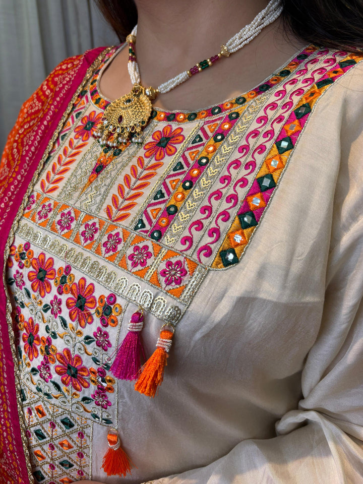 This is a beautiful cream embroidered kurta set with a vibrant bandhani dupatta. The kurta features intricate multicolor thread embroidery and mirror work on the yoke, highlighted with small colorful tassels for a festive touch. The simple cream base gives it an elegant and graceful look, while the orange and magenta bandhani dupatta with traditional motifs and borders adds a striking contrast, making it the highlight of the outfit.