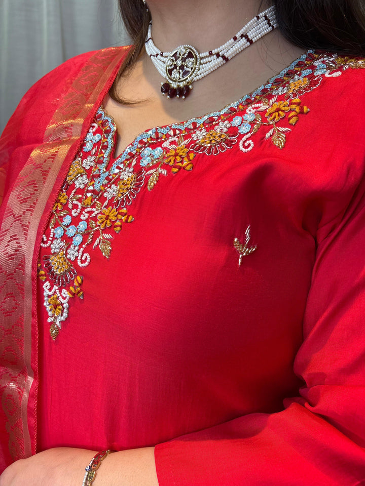 RED MUSLIN HANDWORK SUIT SET WITH FLORAL PRINTED DUPATTA