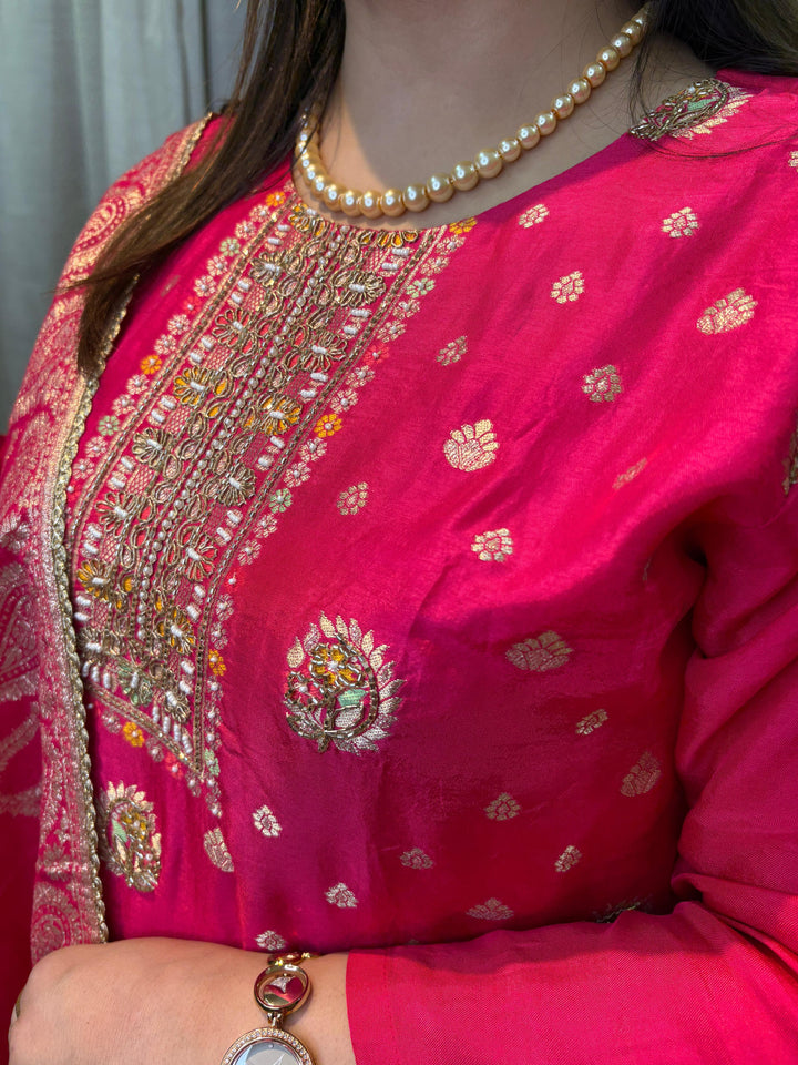 Color: The outfit is a vibrant, striking Rani Pink (hot pink) color.