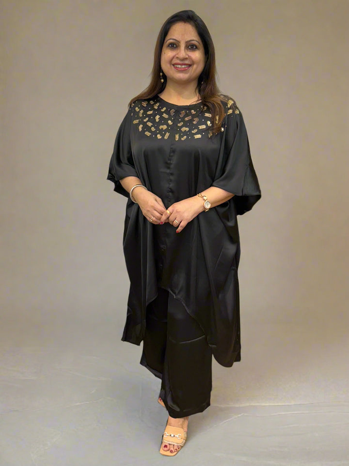 This kaftan set is the perfect mix of elegance and comfort. The flowy silhouette is enhanced with delicate golden embellishments on the neckline, giving it a festive charm. Paired with matching straight pants, it’s ideal for evening gatherings and celebrations.