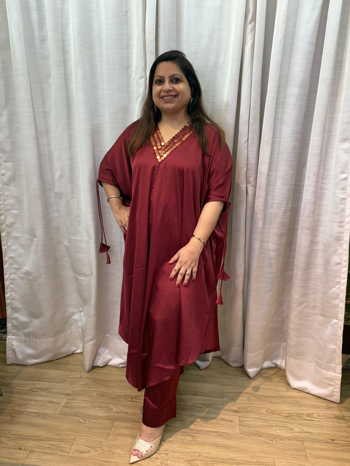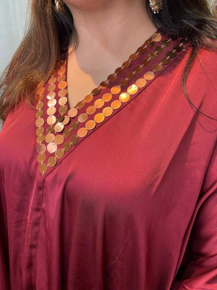SATIN MAROON SEQUIN EMBELLISHMENT KAFTAN SET