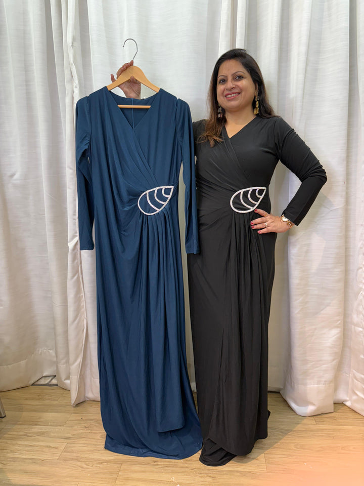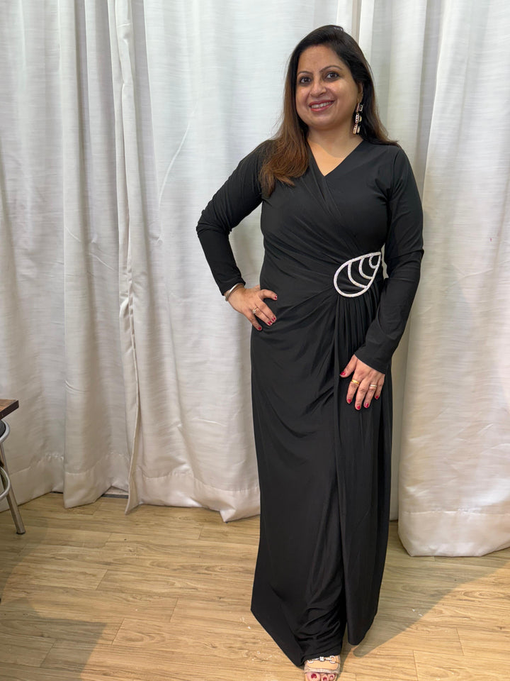 This elegant gown exudes timeless sophistication with its sleek full-sleeve design. The gathered drape detail at the waist, highlighted by a sparkling embellishment, adds a flattering touch. Perfect for evening occasions, it strikes the right balance between classic and glamorous.