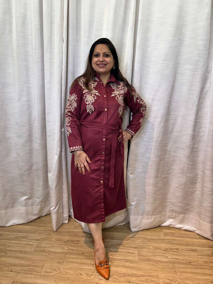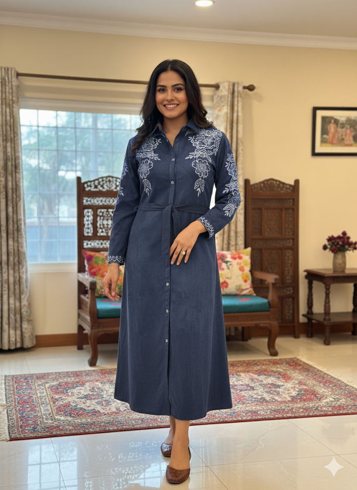 Step out in luxurious comfort and refined style with our Embroidered Velvet Shirt Dress.