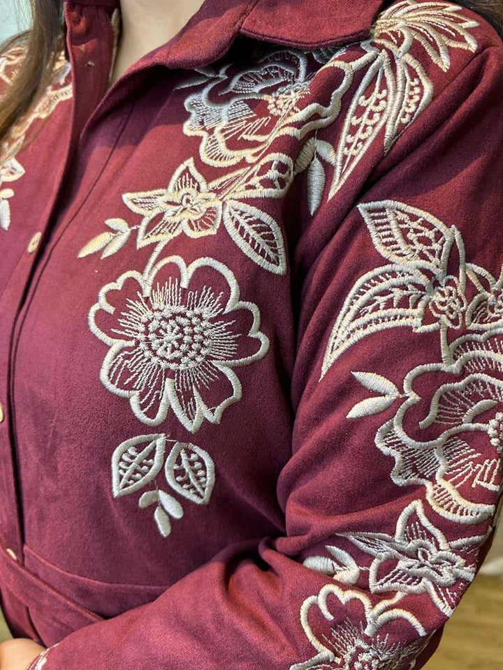 Crafted from sumptuously soft suede, this midi-length dress combines the timeless appeal of a button-down shirt with elegant, modern details. The rich hue is the perfect canvas for the intricate white-tone floral embroidery that adorns the shoulders and sleeves, lending a touch of regal sophistication.