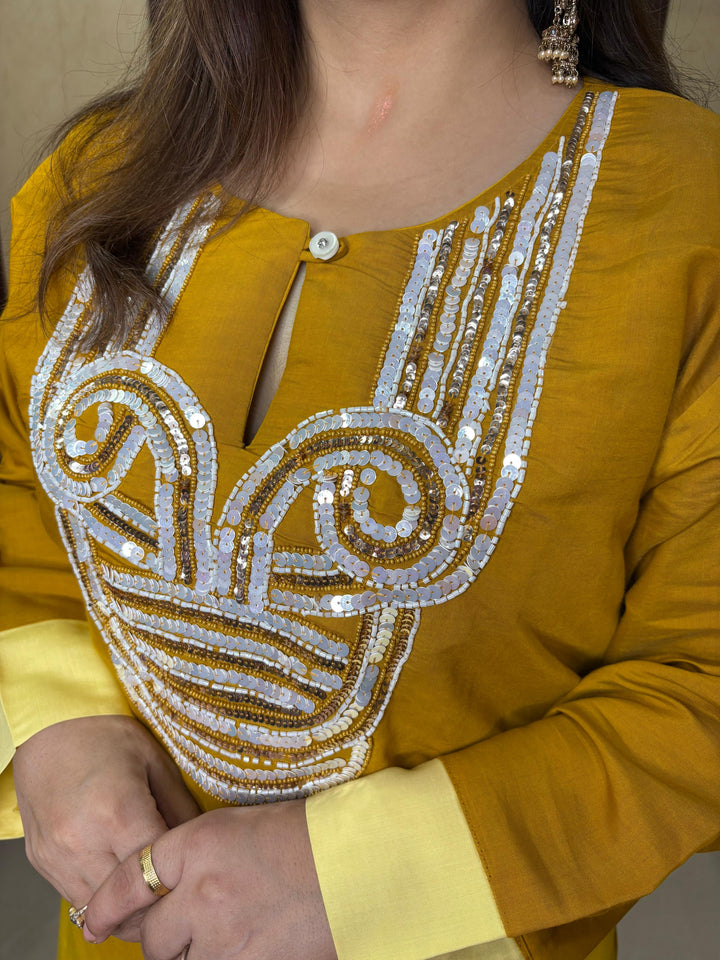 Brighten your style with this sunshine yellow ombre kurta set, highlighted with elegant silver sequin embroidery on the neckline. A chic blend of simplicity and grace, perfect for festive wear, casual outings, or family gatherings.