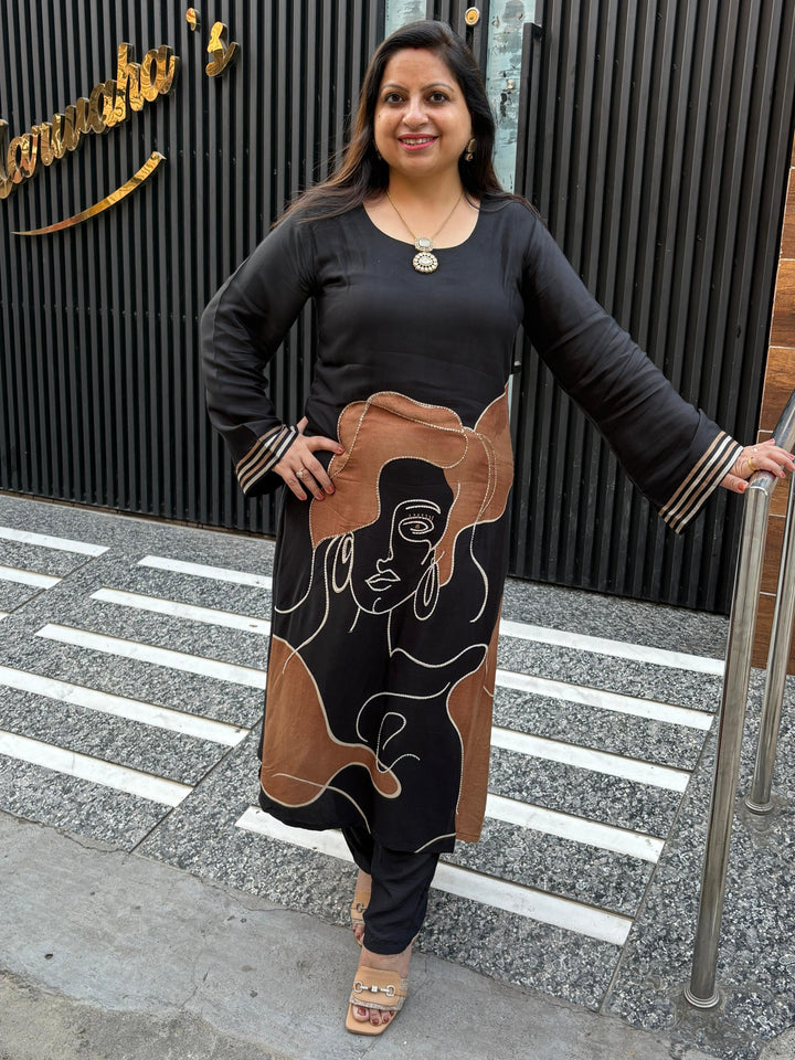 This striking black long kurti is crafted from a comfortable, flowing fabric, ensuring a flattering drape and all-day comfort. The showstopping feature is the bold, abstract face-line artwork in tan and contrasting white embroidery, creating a powerful, modern, and artistic feel.