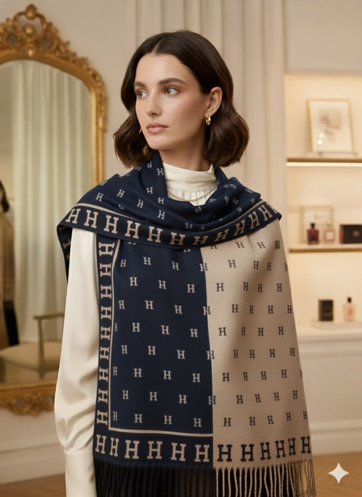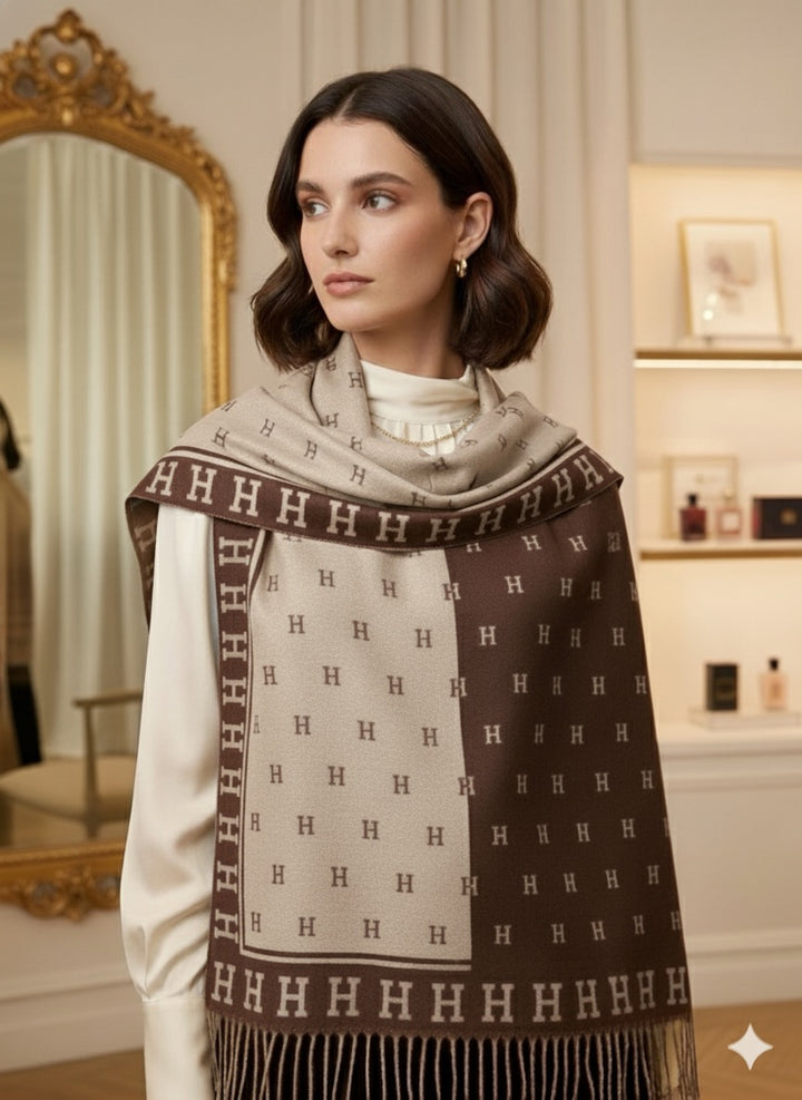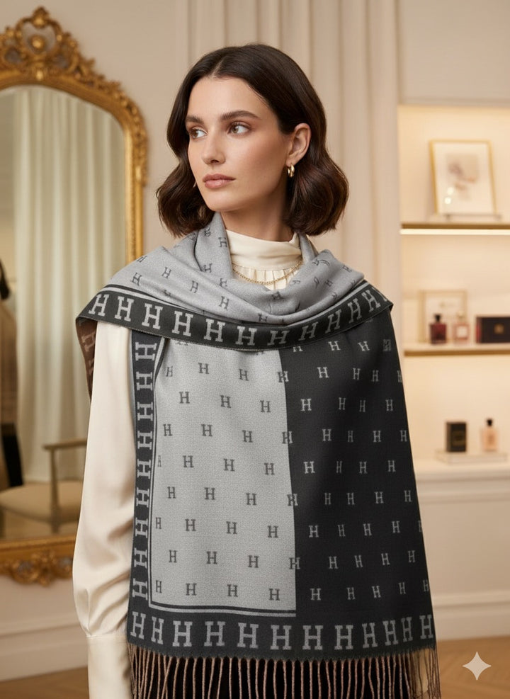 Wrap yourself in timeless elegance with this exquisite stole. Featuring a distinct, large-scale signature letter motif, the design creates a bold yet refined statement. The luxurious, soft-touch fabric drapes beautifully, offering superior comfort and warmth. It's finished with classic fringed edges, making it the perfect accessory to elevate any look, from casual daytime wear to elegant evening attire. A true investment piece for the discerning wardrobe.