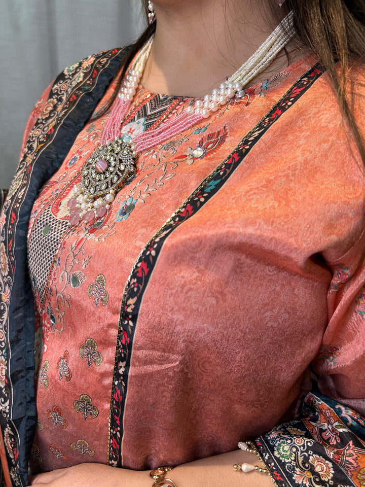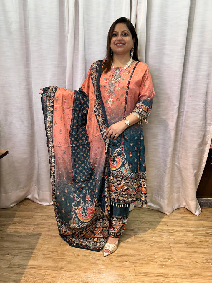The accompanying dupatta is the set's centerpiece. It combines both the Coral/Peach and Teal/Midnight Blue colors in a luxurious print, often incorporating large, ornate Kashmiri or Persian-style motifs framed by intricate borders. This bold, printed drape beautifully ties the entire ombré look together.