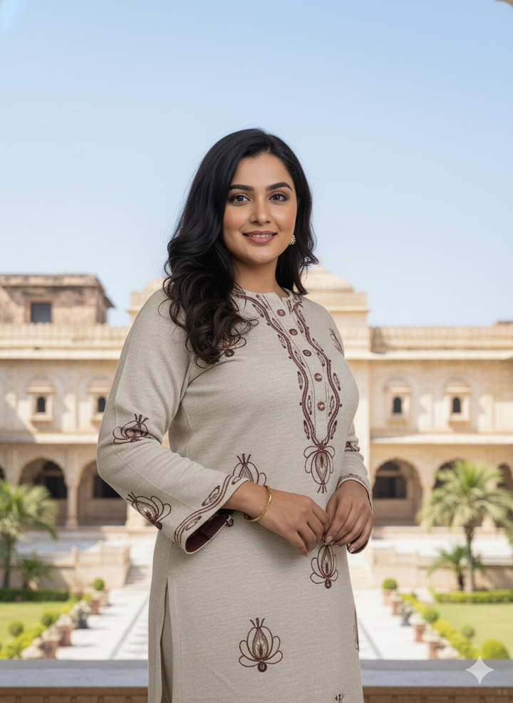 The Tunic (Kurti) features elegant, simplified floral motifs embroidered in a beautiful Deep Maroon or Rust color, focused around the neckline and scattered along the hemline. The same deep color is used to accent the inside of the flared cuffs, adding a rich contrast. The Kurti has a comfortable straight cut with a subtle bell-sleeve detail.