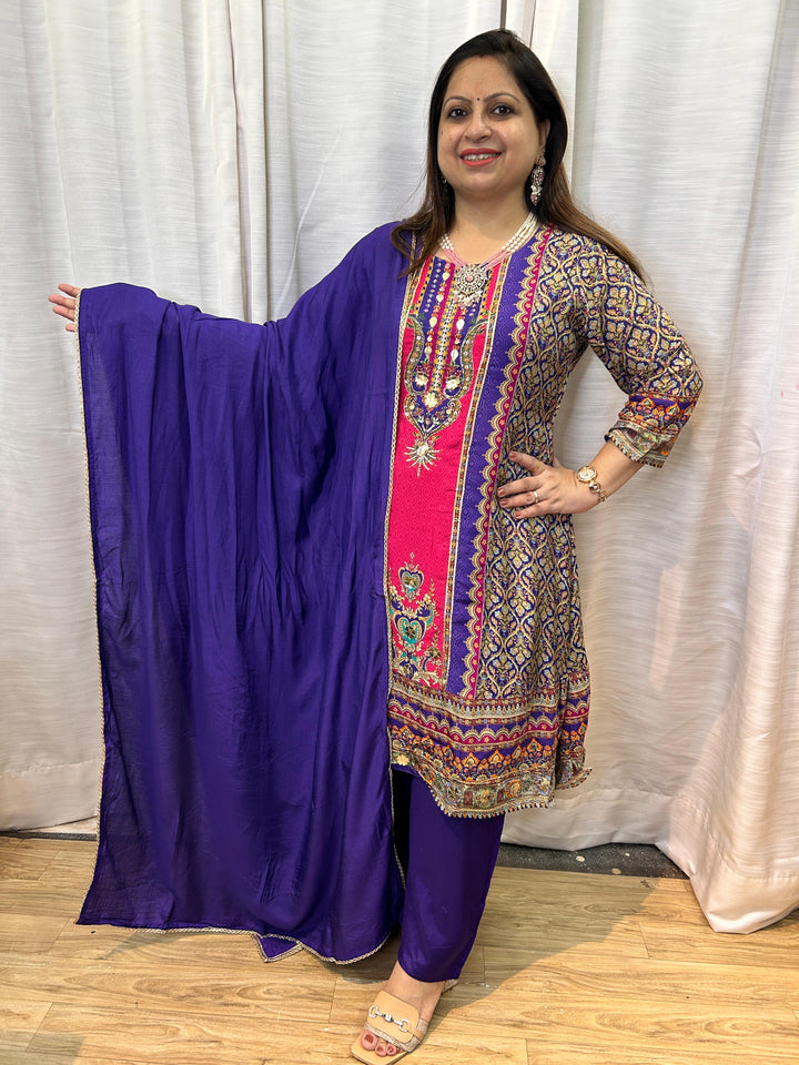 Solid Trousers: The suit is paired with solid-colored deep purple trousers , perfectly matching the primary tones of the kurta's print for a cohesive look.