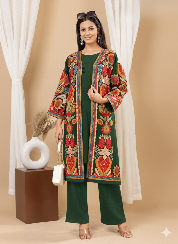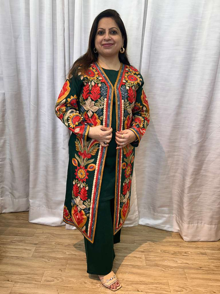 Elevate your ethnic wardrobe with this stunnin Kashmiri embroidered long jacket set, a perfect blend of tradition and elegance. Crafted with exquisite multicolor thread embroidery inspired by Kashmiri artistry, this outfit showcases intricate floral and geometric patterns that bring timeless charm to your look.