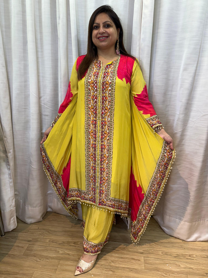 This outfit is a vibrant yellow and pink embroidered kurta set designed for festive and wedding occasions. The yellow kurta is highlighted with striking pink panels on the shoulders and sleeves, along with a detailed multicolour embroidered border running down the front, sleeves, and hemline. Tiny bead tassel details on the edges add extra elegance. It is paired with matching yellow straight pants featuring the same embroidery at the hem. Styled with beige embellished heels, this ensemble is perfect for haldi functions, festive celebrations, or daytime weddings.