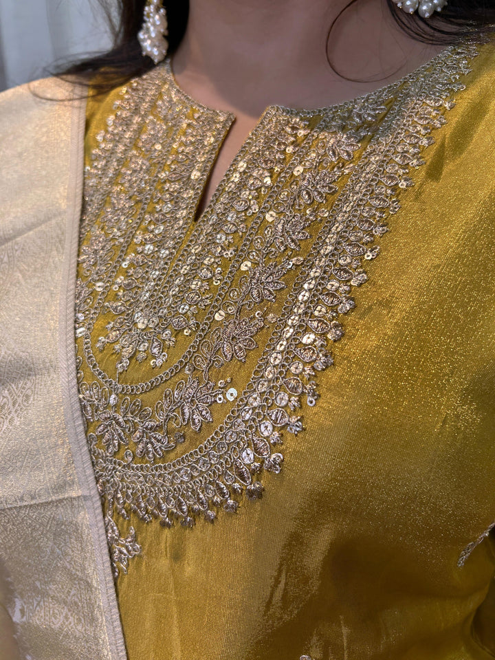 YELLOW HANDWORK DIVIDER SET WITH IVORY DUPATTA