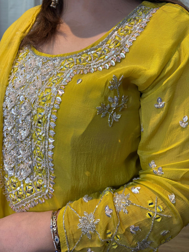 Radiate festive charm in this bright yellow embroidered suit set, designed with intricate detailing and a graceful silhouette. Perfect for weddings, festivals, and celebrations, this outfit blends tradition with elegance.